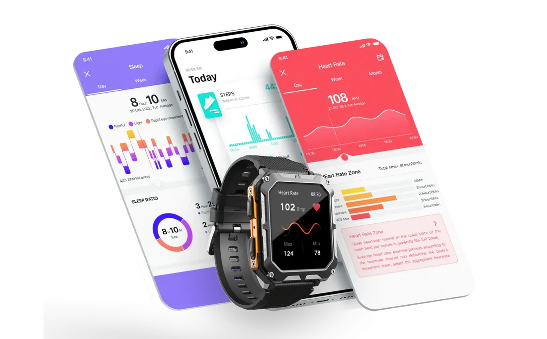 Fréquence cardiaque en continu, SpO₂, pas/calories, modes sport essentiels. But : rester informé, pas remplacer un dispositif médical.